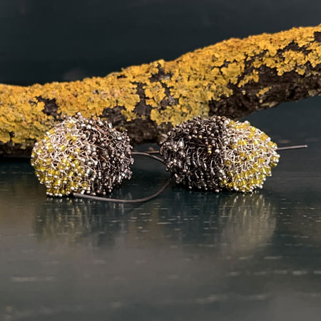 Handcrafted from fine brass wire, the earrings are meticulously crocheted and then plated with sterling silver. The silver is partly oxidised to provide the perfect backdrop for the different coloured beads. And the grey and lime tones of the Swarovski beads represent a beautiful mix of elegance and fun.