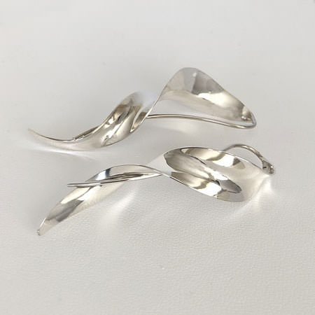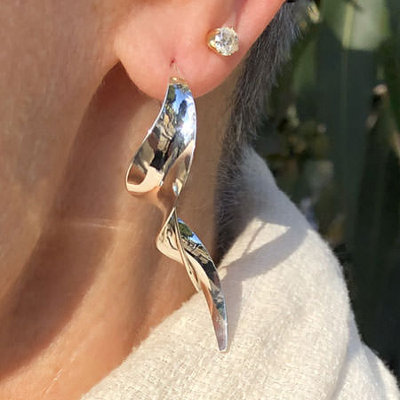 These Ballerina sterling silver earrings have a long, softly curved shape that wraps around itself. The long ear wire is shaped to lock around the earring as part of its design. The ability to do this without damaging the ear wire comes from an old metalsmithing technique. The traditional technique of hand forging and anti-clastic hammering creates the strength and flexibility needed to allow the ear wire to spring back into place.