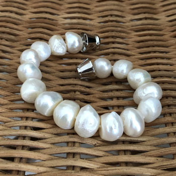 This baroque pearl bracelet has been made with large baroque 13mm white pearls. Baroque freshwater pearls have an uneven surface and they are not perfectly round. This feature gives them a modern and interesting look. Also, no two pearls are exactly the same. The bracelet has a strong magnetic clasp making it easy to put on and it measures 19.5 cm on the inside.