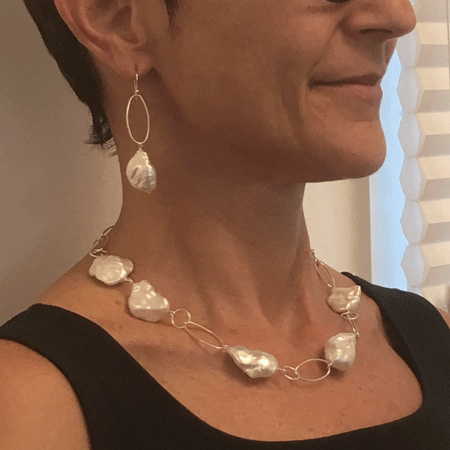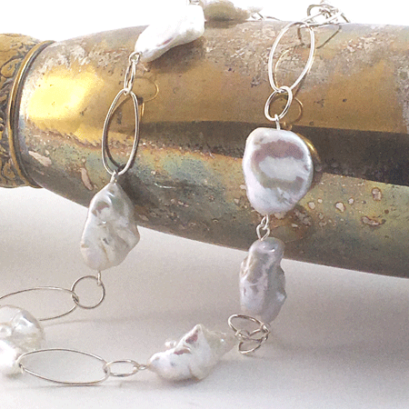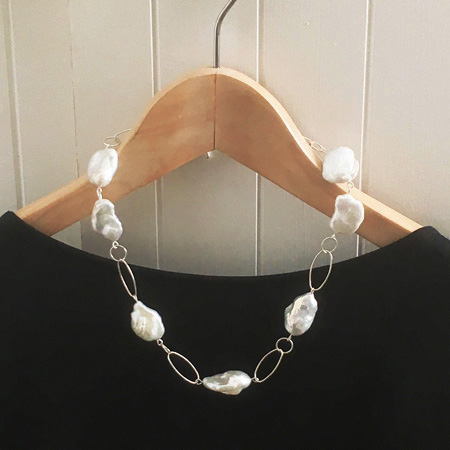 A gorgeous single baroque pearl necklace with large open sterling silver links. This is an open and modern design which lightens and contrasts the look of the large pearls.