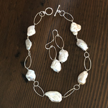 It has 7 large, flat baroque pearls and closes with a sterling silver toggle clasp. A toggle clasp is a T-bar and a circle and is very easy to open and close.