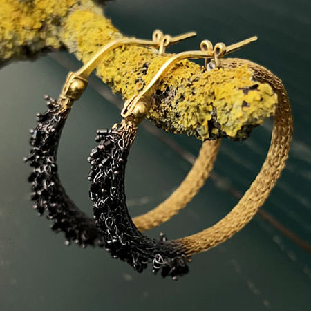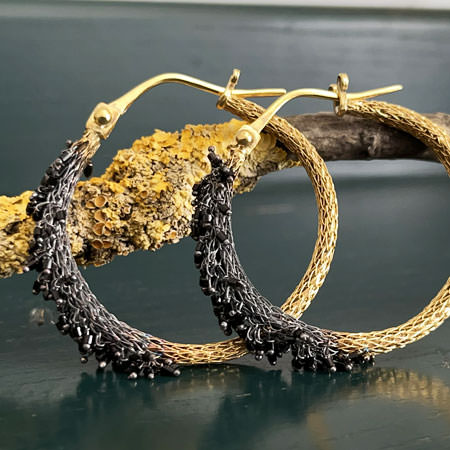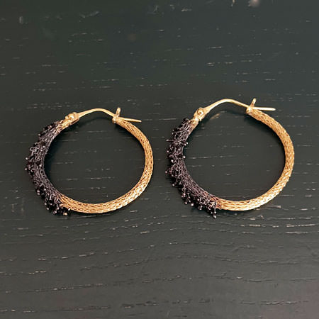 The gold hoop earrings are crocheted by hand from fine brass wire and plated in 24ct gold. The front half of the hoop earrings are decorated with tiny, black Swarovski beads that hang loosely against a dark oxidised background.