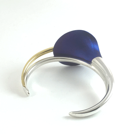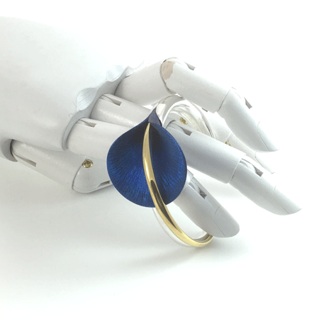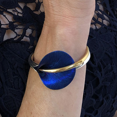 Crafted in solid sterling silver, this bracelet features a large blue calla lily flower made from titanium, heated to achieve its vibrant blue with a hint of purplish lustre. The stamen, plated in thick 24ct gold, curves elegantly along the bracelet, adding a touch of luxury. Its weight and meticulous finish reflect the exceptional craftsmanship by a skilled Polish jeweller. View our full range of calla lily jewellery here.