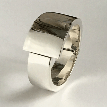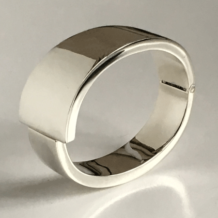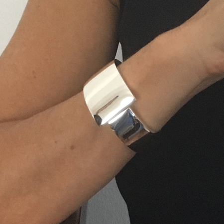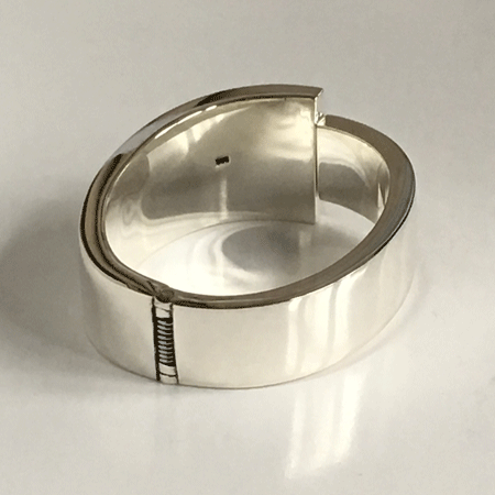 This high polished bangle has a spring hinge and is 3cm at its widest.