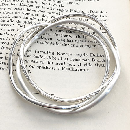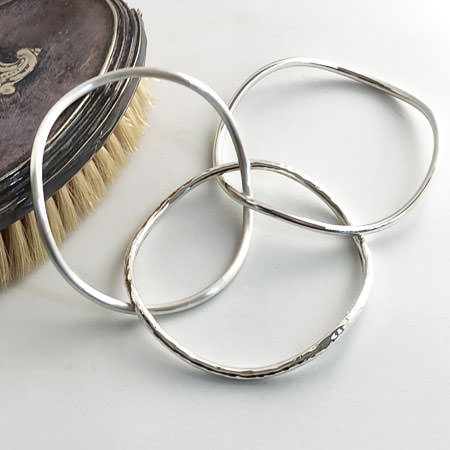 These 3 sterling silver stacking bangles are interlaced so they always sit as a set on your wrist. They have a smooth curved shape and each of the three bangles have different silver finishes. One is highly polished, another satin and finally hammered silver.