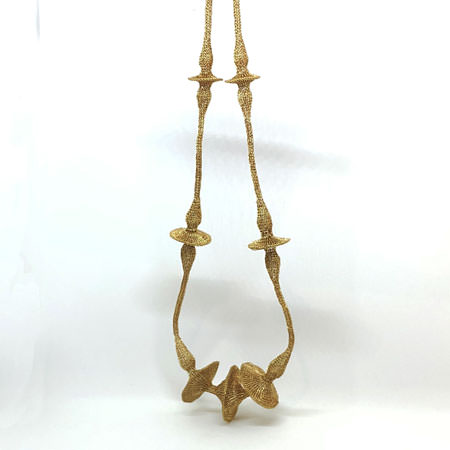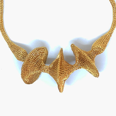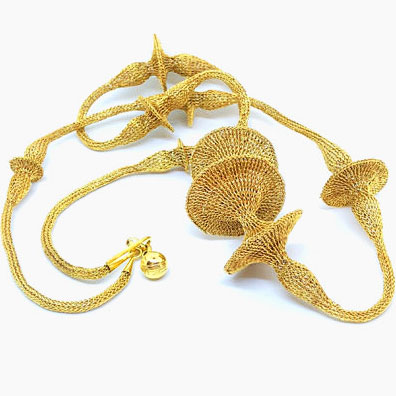 A stunning Milena Zu necklace in her amazing signature mesh design. It is completely handmade, crocheted by hand using fine brass wire which has been plated with gold. The gold is a beautiful, rich and warm gold colour and with its slightly edgy design, it makes for an amazing evening piece.