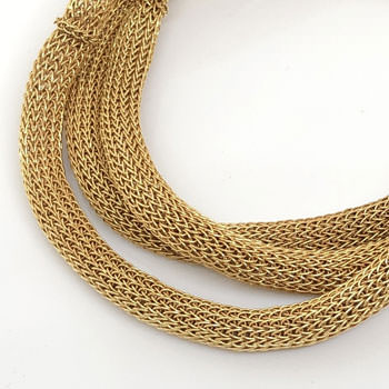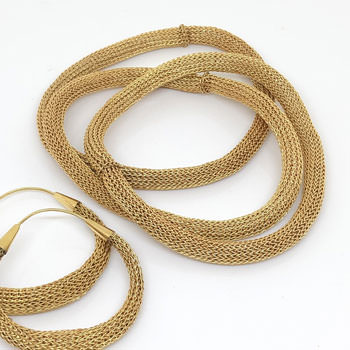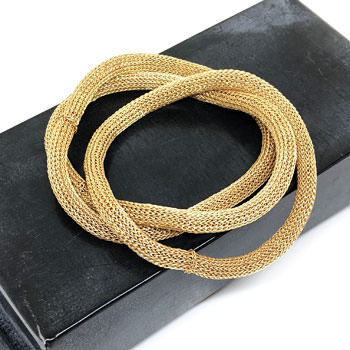 Italian jewellery designer Milena Zu works with Indonesian artisans to create her edgy and contemporary jewellery range. The bracelets are crocheted by hand in fine brass wire which has been plated with gold.