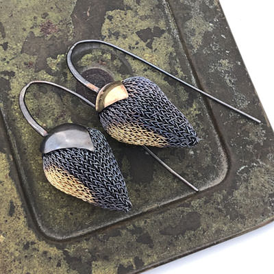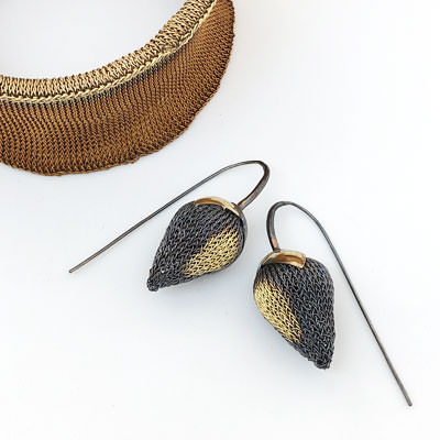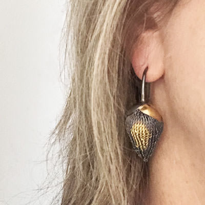 The earrings are made by hand by crocheting fine copper wire. The copper wire has then been oxidised and partly plated with 24ct gold. The crocheted pods hang under two leaves, one dark and one gold plated.