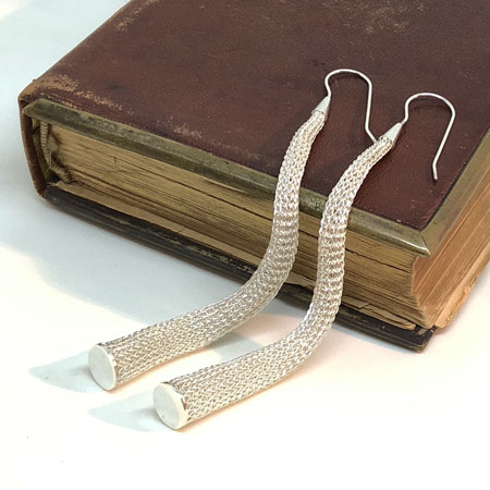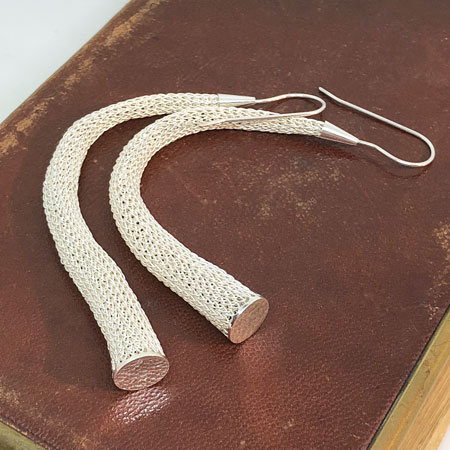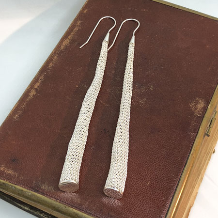 The earrings are hand crocheted with fine brass wire and sterling silver plated. They are 10cm long and 8mm wide at the bottom.