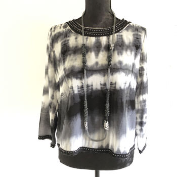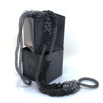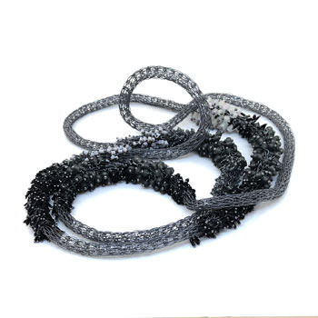 Indonesian artisans meticulously handcraft this stunning piece, embodying Milena Zu’s vision of edgy, beautiful jewellery. Crafted from fine brass wire that’s been silver-plated and oxidised to a warm charcoal grey, this necklace stands out. Thousands of Swarovski beads, each hand-attached, decorate the piece, giving it an intricate and detailed appearance. The beads vary in shape and size, with colours ranging from black to multiple shades of grey. This combination creates a soft, undulating effect that adds to the necklace’s fluid and harmonious look.