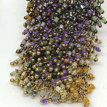 These earrings are exquisite and decadently looking with hundreds of soft purple, green and gold Swarovski beads. The coloured beads are blended meticulously to create a soft colour gradient.