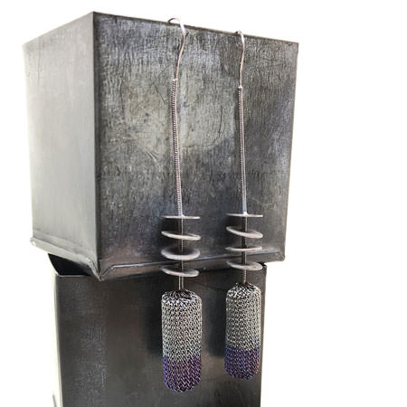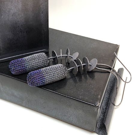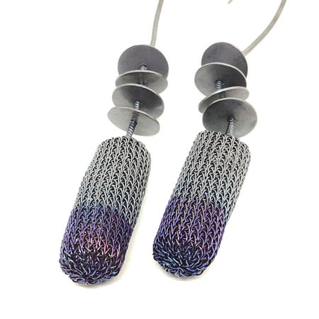 These Riegel drop earrings are very elegant in their contemporary style and muted colours. The earrings have a cylinder shape crocheted in fine brass wire and silver plated. It has been oxidised to a dark, warm charcoal colour with the bottom half a beautiful bluish/purplish tinge. Above the cylinder shape are 4 discs on a sterling silver chain all oxidised to a warm grey tone.
