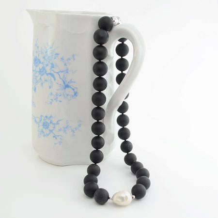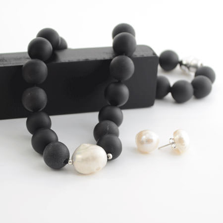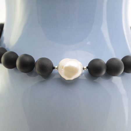 This substantial necklace has large black matte onyx beads and a large baroque pearl as the centre piece.