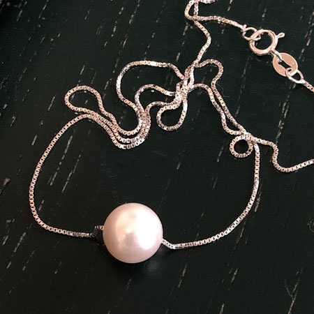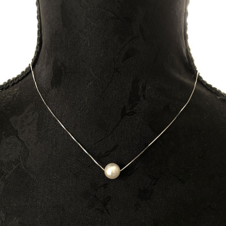 A beautiful, white (AAA) 8mm freshwater pearl on a very fine 40cm or 42cm sterling silver box chain. The necklace is a choker length and the pearl will sit in the hollow over the collar bone.