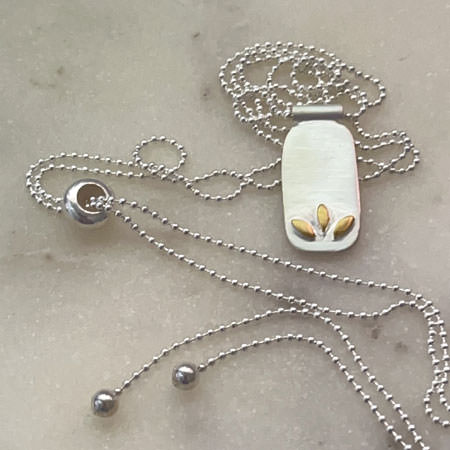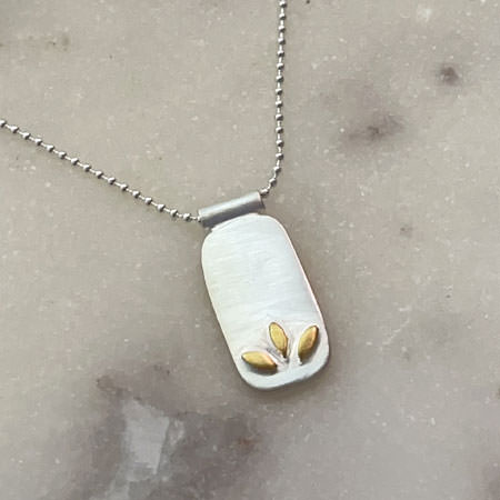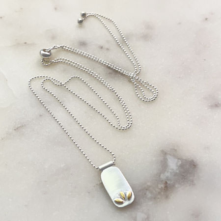 Designed in Australia and crafted with care by skilled Balinese silversmiths, it’s made from 925 sterling silver. The rectangular pendant features three small leaf designs, thoughtfully moulded above a matte-finished surface, and highlighted with 18ct gold plating.
