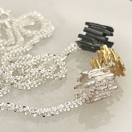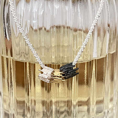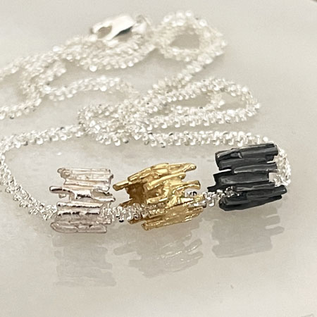 Three unique pendants glide loosely on a sterling silver Margarita chain. The tube pendants are made in sterling silver with a resemblance of tubular rocks. The charcoal, gold and silver combination is warm and beautiful.