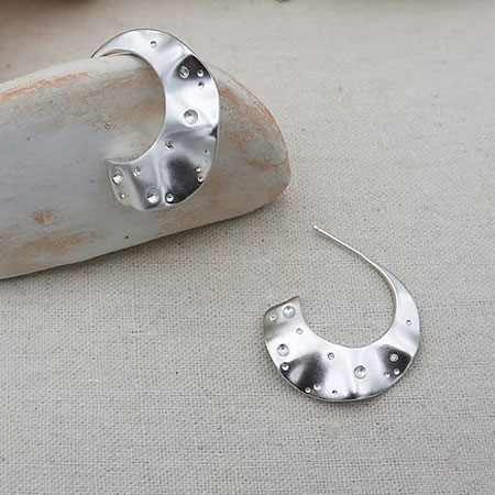 These unique silver hoops are a perfect companion to any outfit. They have a soft wavy design with little, round indents scattered over their highly polished sides.