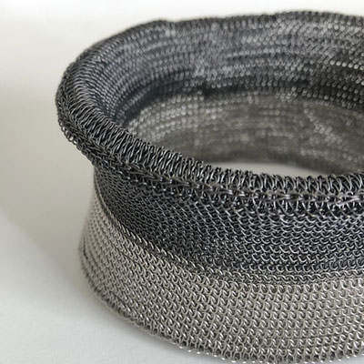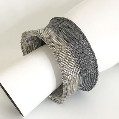 It is crocheted completely by hand. Made from very fine stainless steel wire and brass wire plated with silver and oxidised to a charcoal grey. The bangle has a double layer of mesh giving it thickness and firmness.