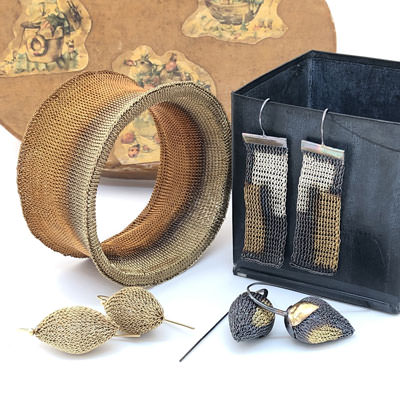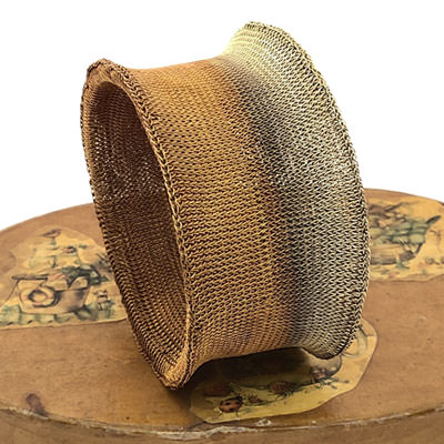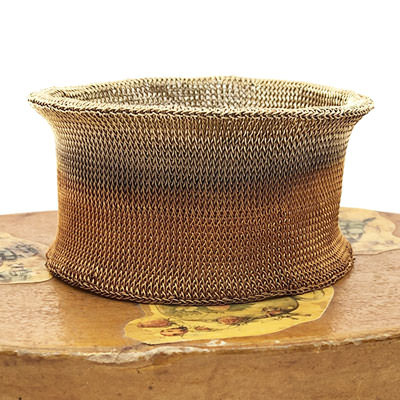 It is crocheted completely by hand and is made from very fine brass wire. The brass wire has been plated in gold and partly oxidised to a warm, bronze like colour. This is a Milena Zu design piece and is part of our large range of Milena Zu jewellery. Milena, who is Italian born, resides in Ubud where local artisans carry out her sometimes intricate designs.