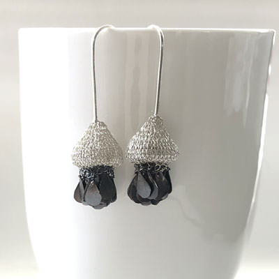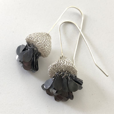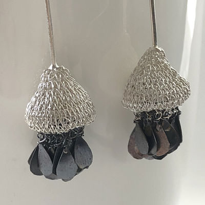 The earrings are handmade from crocheted fine brass wire and plated in sterling silver. The earrings are decorated with small teardrop tassels, each one attached by hand. The tassels are silver plated and oxidised to a charcoal grey.