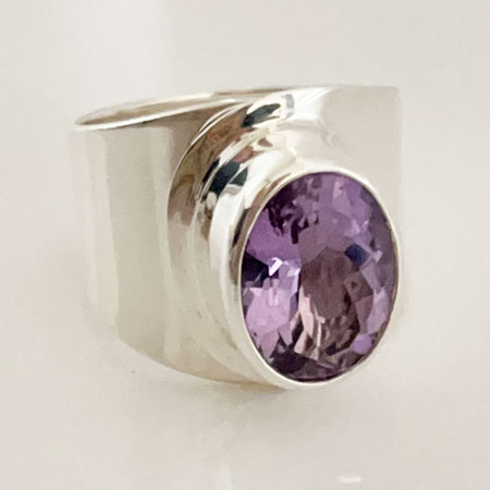 This gemstone ring’s substantial design features a broad sterling silver band, 21mm at its widest point, which gracefully tapers for a comfortable fit. The amathyst is approximately 10/14mm.