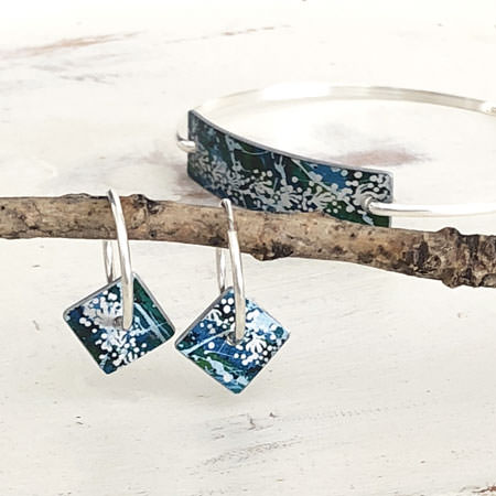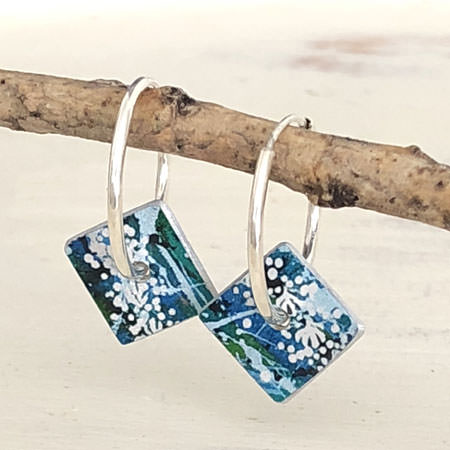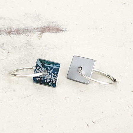 These sterling silver hoops have a little square charm threaded on them. The charm is aluminium which has been photo anodised with the licensed aboriginal art.