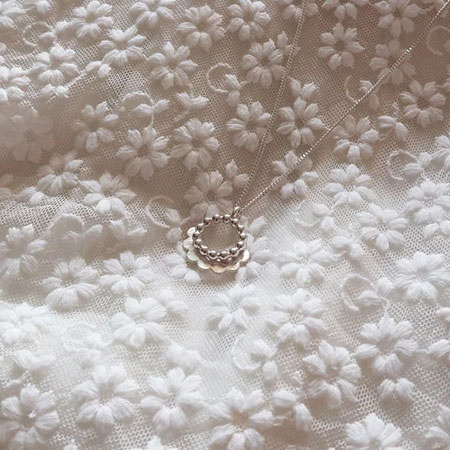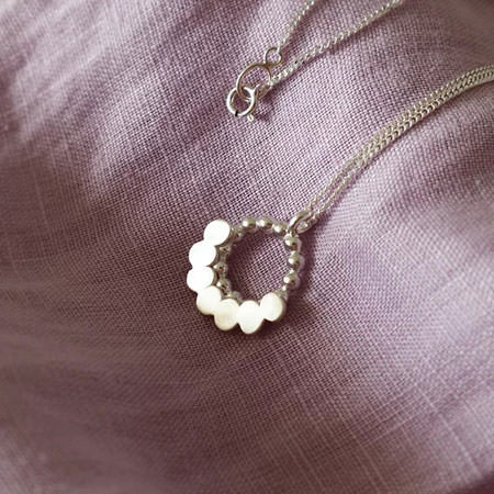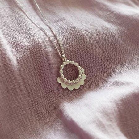 It is an Australian sterling silver pendant with a circle of silver beads partly framed by a scalloped edge. The pendant is 22mm wide and hangs on a 50cm sterling silver chain.
