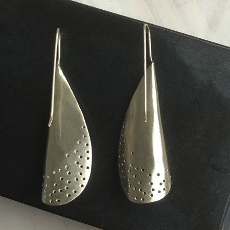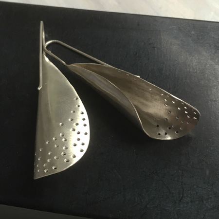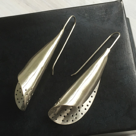 The long drop earrings are curled over and perforated with tiny holes along the back edge…almost resembling a curled up autumn leaf.