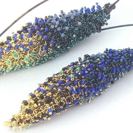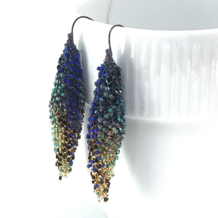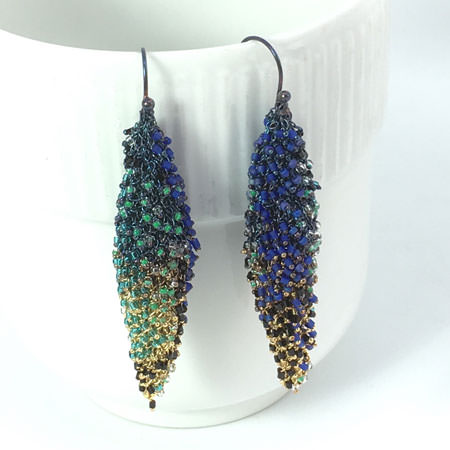 These mesh earrings are just exquisite. The elongated shape has been crocheted with fine brass wire which is then plated in gold and silver which has been oxidised to a dark, almost bluish colour. The shape is then covered with hundreds of tiny Swarovski beads in colours graduating from blues and greens to black.