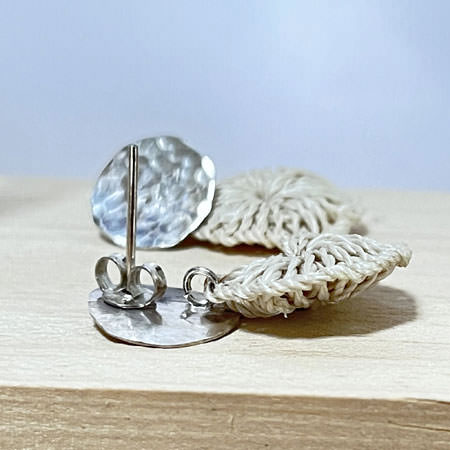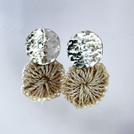 The earrings are handmade by artisans in Papua New Guinea. The little puffed fibre discs are made with a traditional bilum weaving technique which is a knotless weave using a single needle. The fibre itself is made from local plants, dried in the sun, pulled and rolled into a continuous string. The silver discs are made from recycled sterling silver and has a hammered finish.