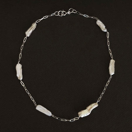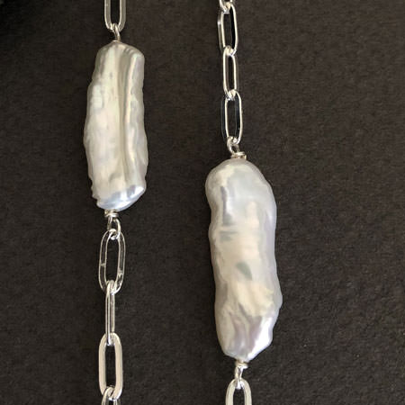 This sterling silver pearl necklace has 6 lustrous, large Biwa pearls spread through a sterling silver chain of high polished elongated links. The Biwa pearls are beautifully reflective with a pearly colour play.