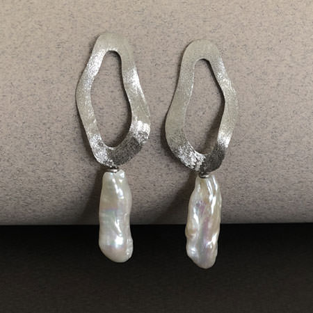 These sterling silver pearl earrings have a flat, organically shaped loop with a shiny, brushed silver finish. A big and lustrous Biwa pearl with a beautiful play of pearly colours hang from the bottom of the loop.