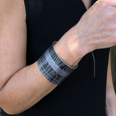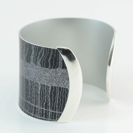 This black Australian cuff bracelet uses licensed aboriginal art. The artwork is transferred onto anodised aluminium which is then handcrafted with sterling silver caps. The bracelet has a beautiful and very smooth finish.