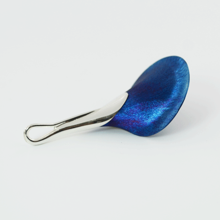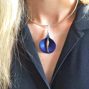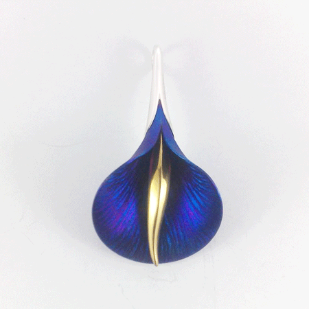 This calla lily pendant is handcrafted by a Polish jeweller who has perfected the skill of working with titanium to get this beautiful blue and purplish lustre which doesn’t at all come to its right in the photos.