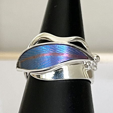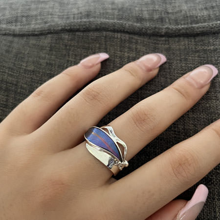 A perfect leaf with perfect vein lines. A beautiful peacock blue with very fine veins running through it. Our current one in stock has veins in a light purple colour against the blue leaf. Each ring is handmade and the colours vary slightly every time.
