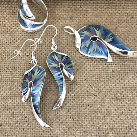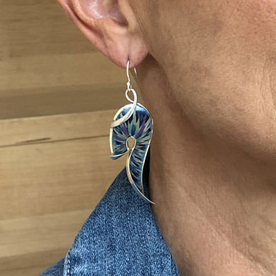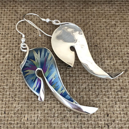These earrings feature a curved piece of niobium with a vibrant pattern in shades of blue, yellow, and pink. The niobium is set in sterling silver, with high edges curving outward from the centre. The bold, colourful design contrasts beautifully with the sleek polish of the silver.