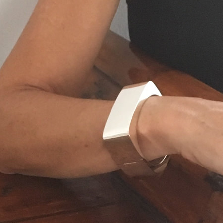This spectacular 25mm wide chunky sterling silver bracelet sits snugly around your wrist. The outside is rectangular but the inside shape is oval for comfort. This bracelet is elegant and modern and will last you a life time…..and more!
