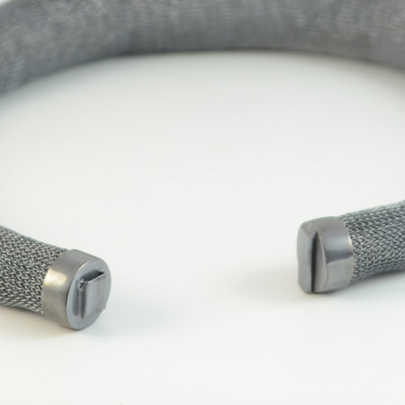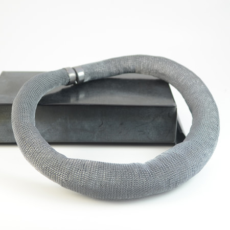 This Milena Zu necklace is made of fine brass wire which has been plated in sterling silver and then oxidised to a rich charcoal colour. The lock is made of stainless steel and oxidised to the same grey colour.