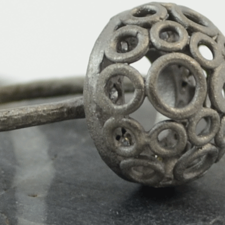 This sterling silver ring has a dome of different sized circles set on a slim band.