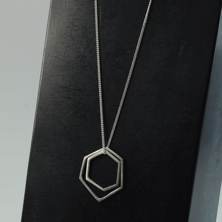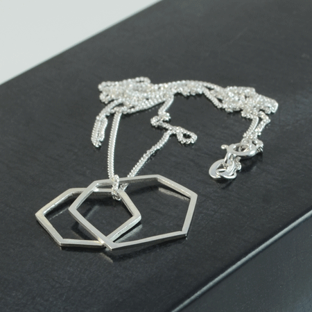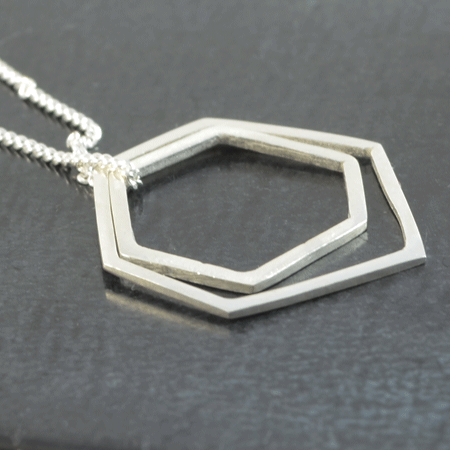 This handmade sterling silver necklace has two hexagonal shapes in slightly different sizes. They hang loosely on a fine sterling silver chain.