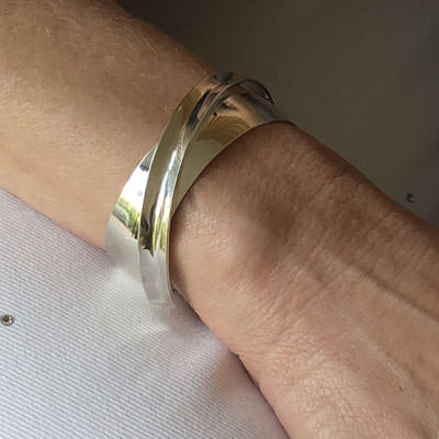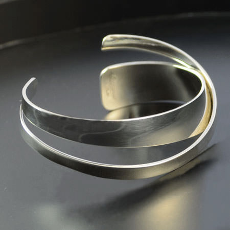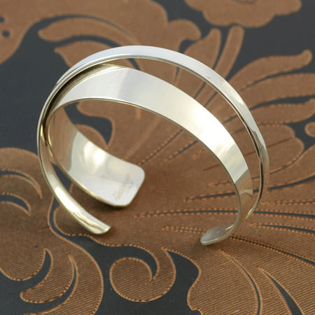 This bracelet has one piece of silver split into two bands with one band widening towards one end with a width of 17mm. The narrow band starts 4mm wide and ends 6mm wide with its sides slightly upturned.