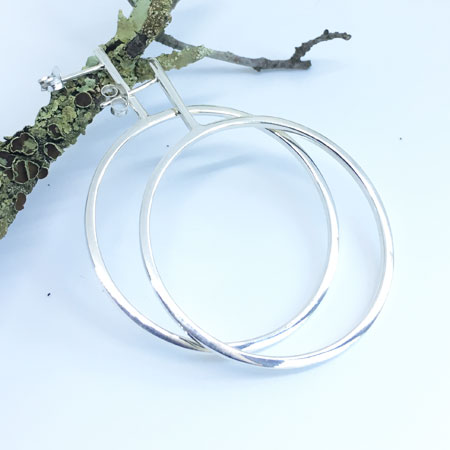 The earrings are Australian handmade in polished sterling silver. The circles themselves are not round but are instead edged with straight sides. The hoops are approximately 40mm long and 25mm wide.