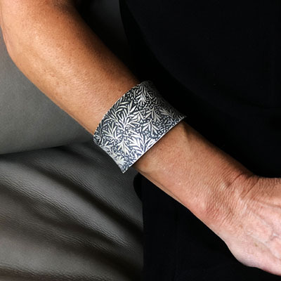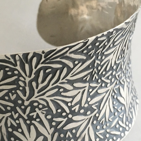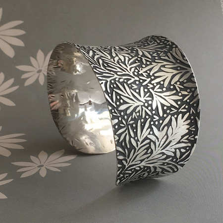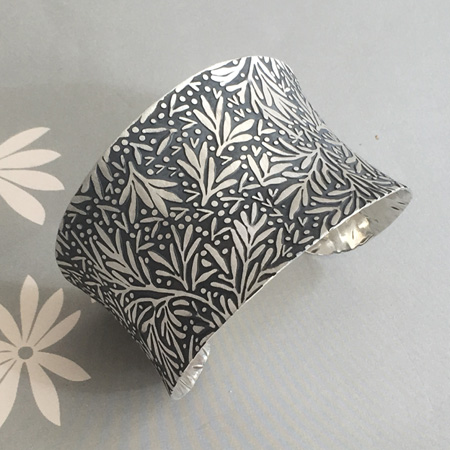 This silver cuff is 43mm wide and has slightly upturned edges. The internal circumference is 18cm.