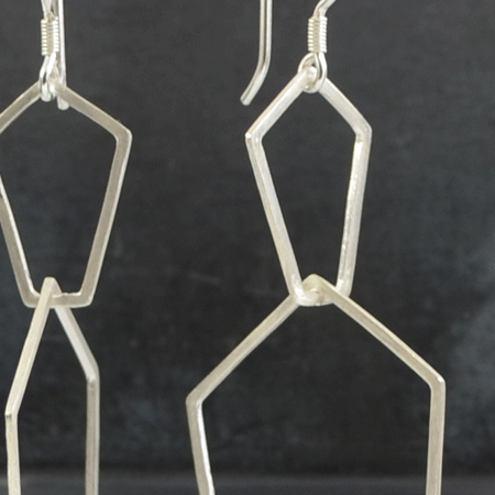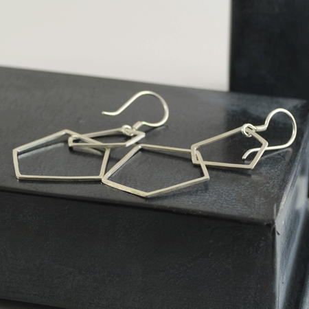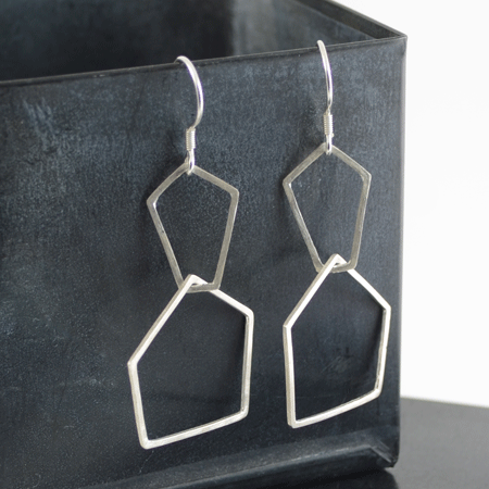 These handcrafted sterling silver earrings have two open, flat pentagon shapes interlinked.