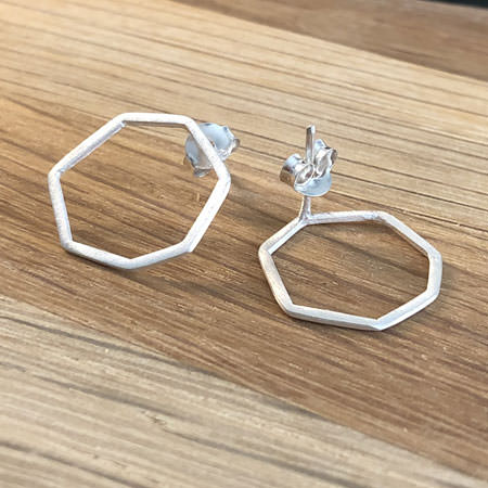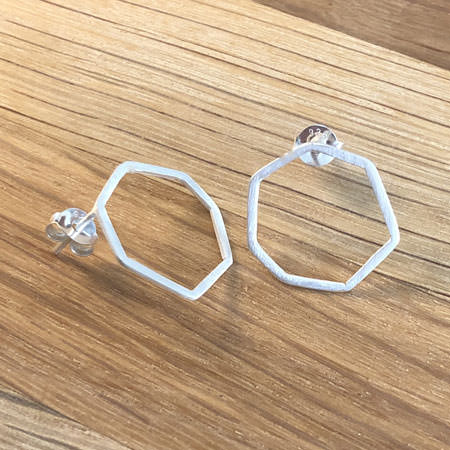 These handmade sterling silver stud earrings have an open hexagonal shape. The shape of these Australian made earrings are often referred to as honeycomb earrings.