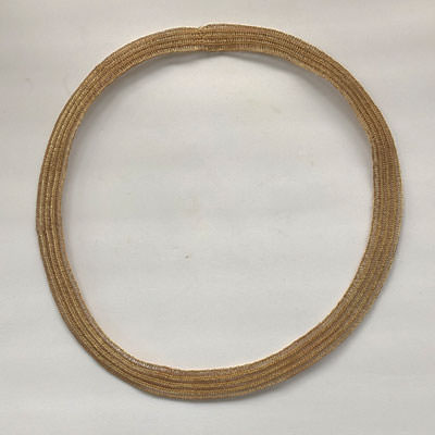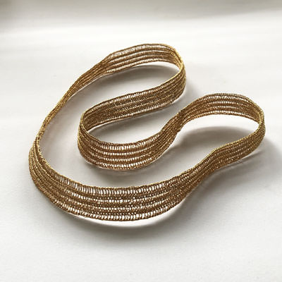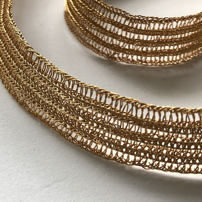 This Milena Zu necklace adds instant glamour to your outfit with its rich gold colour. The necklace is crocheted by hand in a flat style which makes the simple design of the weave stand out. It is made using fine brass wire and plated in 24ct gold.