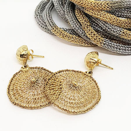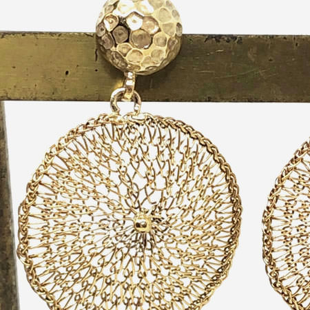 The earrings have a delicate round drop crocheted from fine brass wire plated with 24ct gold. They are crocheted by hand making each pair unique. The earrings are very light and comfortable to wear and you can mix and match them with other pieces from our Milena Zu jewellery range.
