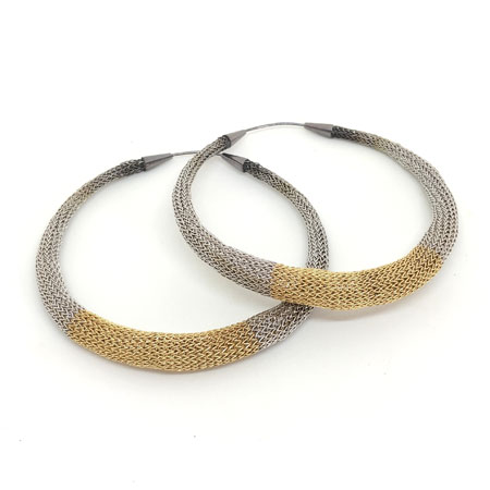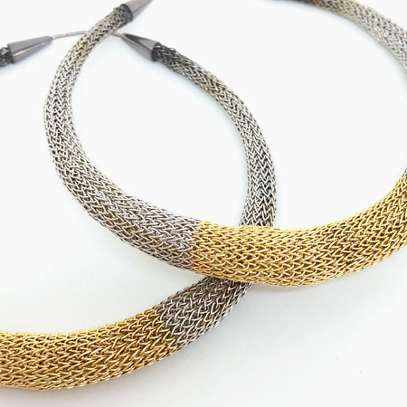 These hoop earrings are crocheted by hand using fine stainless steel wire and brass wire plated gold.