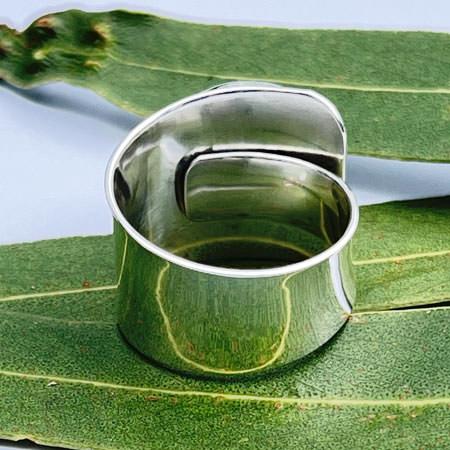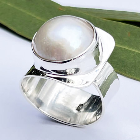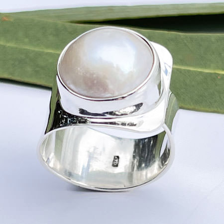 This chunky pearl ring has a large Mabé pearl set on a wide band sterling silver ring. The wide end of the ring band has slightly upturned corners with the band tapering to half the width. The ring band can be adjusted slightly to get a comfortable fit.