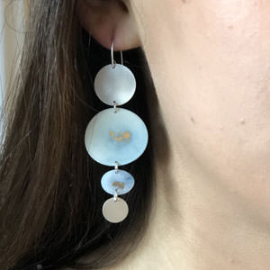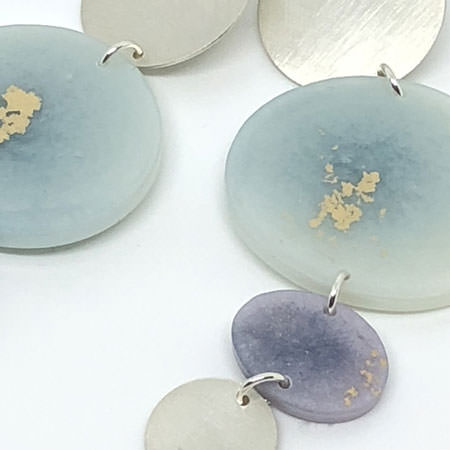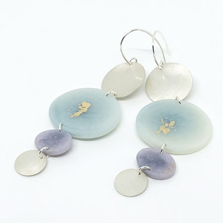These blue drop earrings have two organically shaped resin discs in soft blue and purple shades and with a touch of gold dust. At either end are round sterling silver discs with a brushed finish to give them that strong contemporary touch.